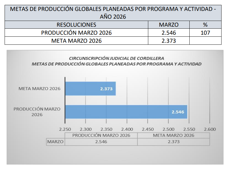 La administradora de la XIII Circunscripción Judicial de Cordillera, Stella Bolaños Valmori, presentó al Consejo de Administración el informe que detalla los resultados de Metas de Producción Global Planeadas por Programa y Actividad – Ejercicio Fiscal 2026, al mes de marzo del corriente año.