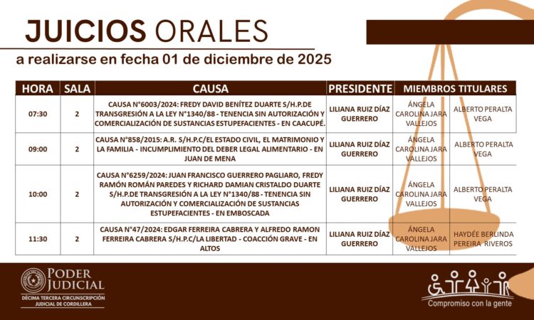 En cumplimiento a las decisiones del Consejo de Superintendencia de la Corte Suprema de Justicia, la Circunscripción Judicial de Cordillera da a conocer el calendario de juicios orales establecido para hoy 01 de diciembre del año 2025.