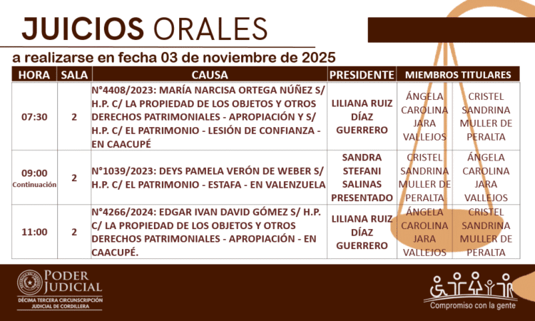 En cumplimiento a las decisiones del Consejo de Superintendencia de la Corte Suprema de Justicia, la Circunscripción Judicial de Cordillera da a conocer el calendario de juicios orales establecido para hoy 03 de noviembre del año 2025.
