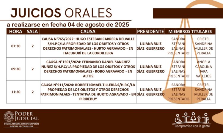 En cumplimiento a las decisiones del Consejo de Superintendencia de la Corte Suprema de Justicia, la Circunscripción Judicial de Cordillera da a conocer el calendario de juicios orales establecido para hoy 04 de agosto del año 2025.