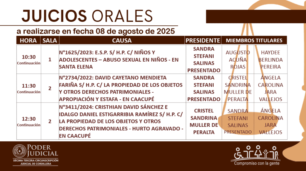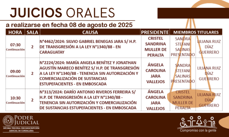 En cumplimiento a las decisiones del Consejo de Superintendencia de la Corte Suprema de Justicia, la Circunscripción Judicial de Cordillera da a conocer el calendario de juicios orales establecido para hoy 08 de agosto del año 2025.
