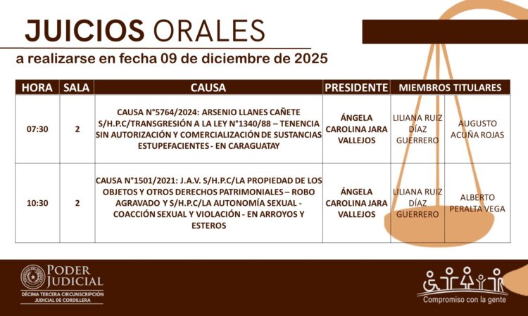 En cumplimiento a las decisiones del Consejo de Superintendencia de la Corte Suprema de Justicia, la Circunscripción Judicial de Cordillera da a conocer el calendario de juicios orales establecido para hoy 09 de diciembre del año 2025.