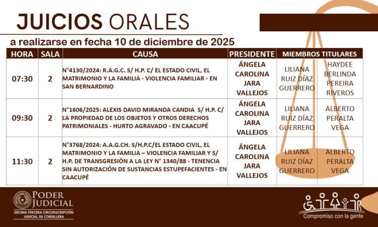 En cumplimiento a las decisiones del Consejo de Superintendencia de la Corte Suprema de Justicia, la Circunscripción Judicial de Cordillera da a conocer el calendario de juicios orales establecido para hoy 10 de diciembre del año 2025.