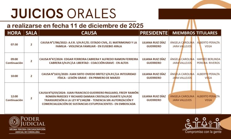 En cumplimiento a las decisiones del Consejo de Superintendencia de la Corte Suprema de Justicia, la Circunscripción Judicial de Cordillera da a conocer el calendario de juicios orales establecido para hoy 11 de diciembre del año 2025.