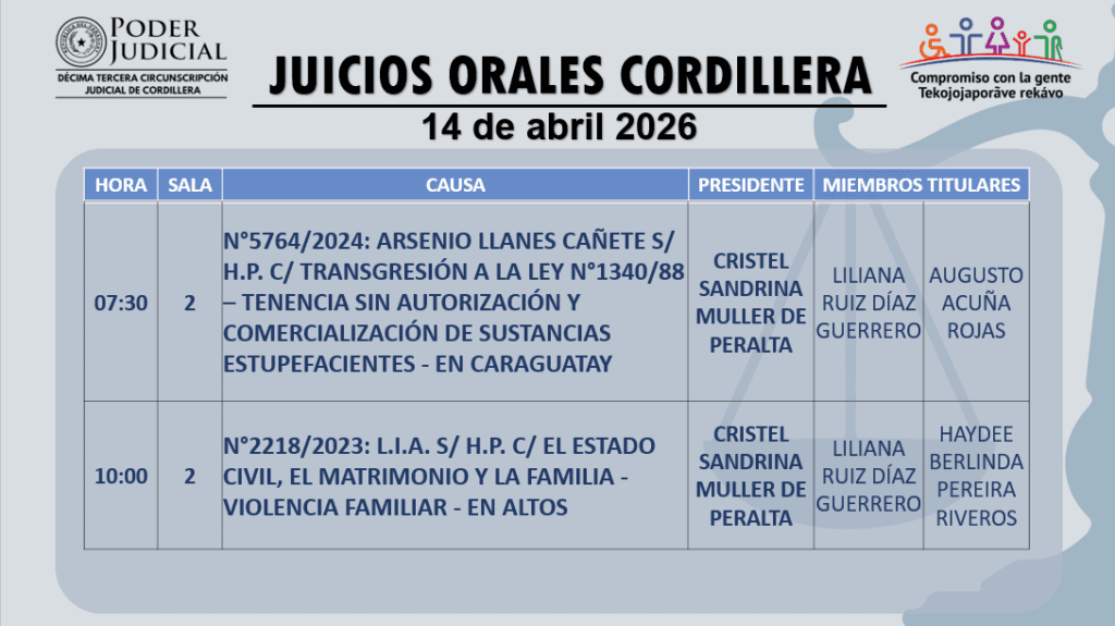 En cumplimiento a las decisiones del Consejo de Superintendencia de la Corte Suprema de Justicia, la Circunscripción Judicial de Cordillera da a conocer el calendario de juicios orales establecido para hoy 14 de abril del año 2026.