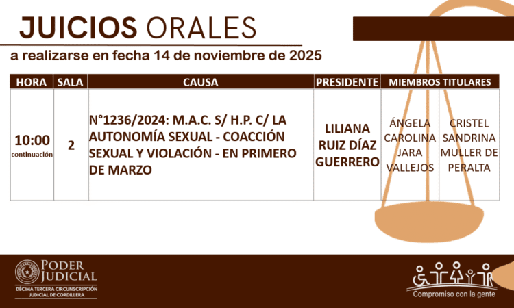 En cumplimiento a las decisiones del Consejo de Superintendencia de la Corte Suprema de Justicia, la Circunscripción Judicial de Cordillera da a conocer el calendario de juicios orales establecido para hoy 14 de noviembre del año 2025.