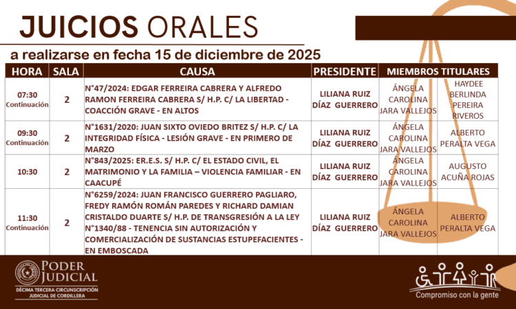 En cumplimiento a las decisiones del Consejo de Superintendencia de la Corte Suprema de Justicia, la Circunscripción Judicial de Cordillera da a conocer el calendario de juicios orales establecido para hoy 15 de diciembre del año 2025.