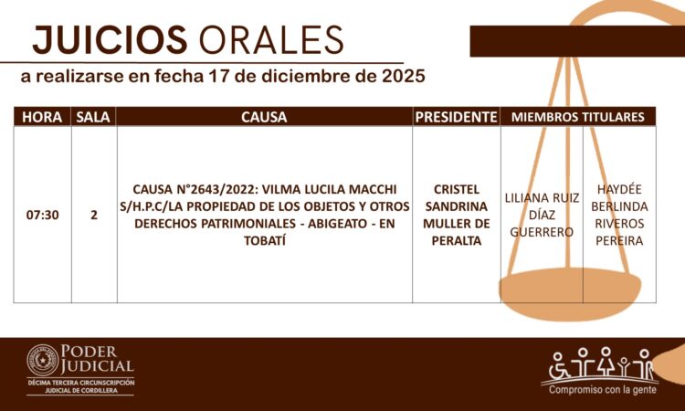 En cumplimiento a las decisiones del Consejo de Superintendencia de la Corte Suprema de Justicia, la Circunscripción Judicial de Cordillera da a conocer el calendario de juicios orales establecido para hoy 17 de diciembre del año 2025.