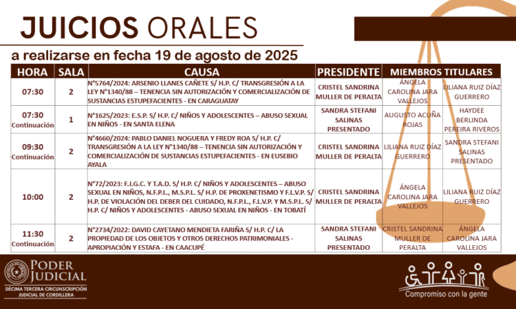 En cumplimiento a las decisiones del Consejo de Superintendencia de la Corte Suprema de Justicia, la Circunscripción Judicial de Cordillera da a conocer el calendario de juicios orales establecido para hoy 19 de agosto del año 2025.