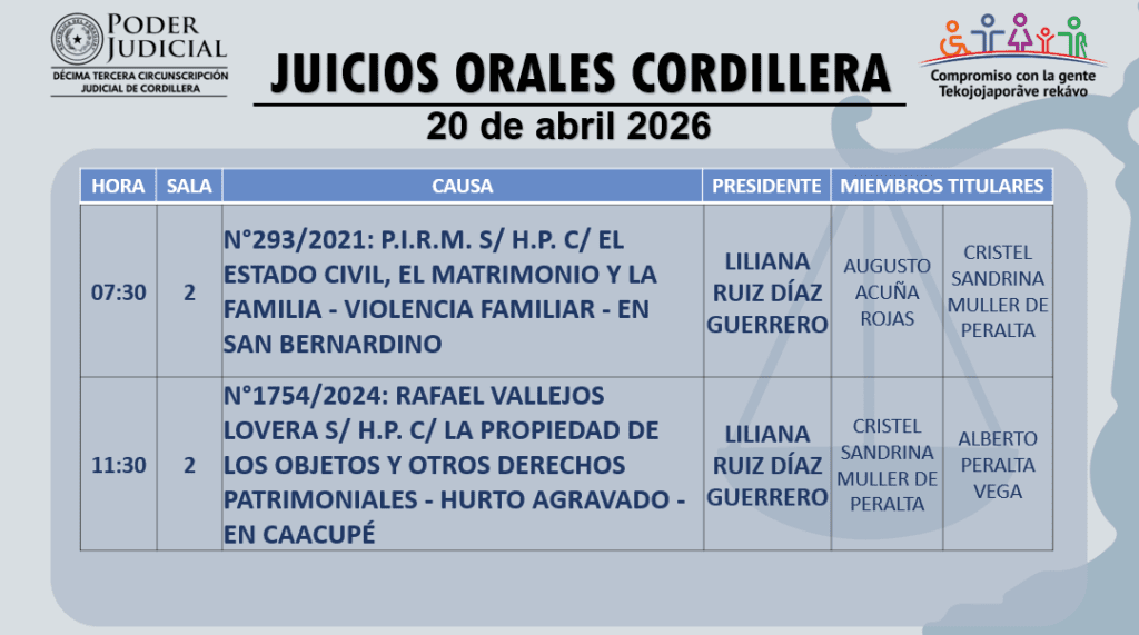 En cumplimiento a las decisiones del Consejo de Superintendencia de la Corte Suprema de Justicia, la Circunscripción Judicial de Cordillera da a conocer el calendario de juicios orales establecido para hoy 20 de abril del año 2026.
