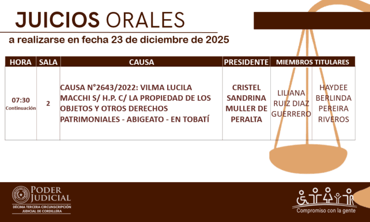 En cumplimiento a las decisiones del Consejo de Superintendencia de la Corte Suprema de Justicia, la Circunscripción Judicial de Cordillera da a conocer el calendario de juicios orales establecido para hoy 23 de diciembre del año 2025.