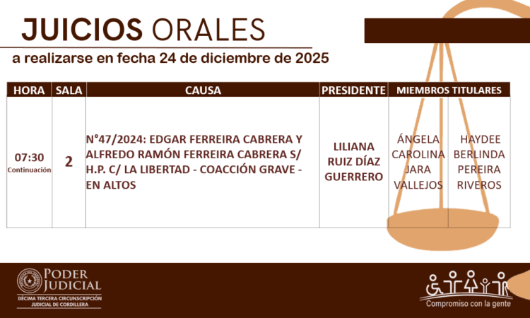 En cumplimiento a las decisiones del Consejo de Superintendencia de la Corte Suprema de Justicia, la Circunscripción Judicial de Cordillera da a conocer el calendario de juicios orales establecido para hoy 24 de diciembre del año 2025.