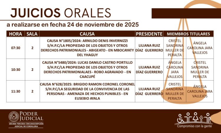 En cumplimiento a las decisiones del Consejo de Superintendencia de la Corte Suprema de Justicia, la Circunscripción Judicial de Cordillera da a conocer el calendario de juicios orales establecido para hoy 24 de noviembre del año 2025.