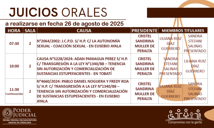 En cumplimiento a las decisiones del Consejo de Superintendencia de la Corte Suprema de Justicia, la Circunscripción Judicial de Cordillera da a conocer el calendario de juicios orales establecido para hoy 26 de agosto del año 2025.