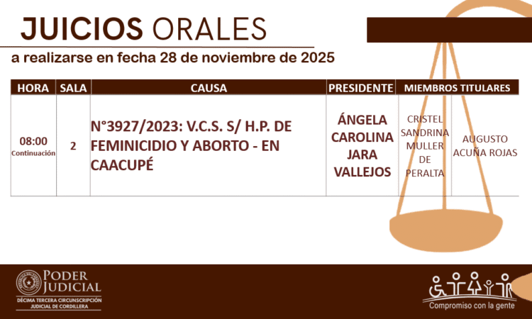 En cumplimiento a las decisiones del Consejo de Superintendencia de la Corte Suprema de Justicia, la Circunscripción Judicial de Cordillera da a conocer el calendario de juicios orales establecido para hoy 28 de noviembre del año 2025.