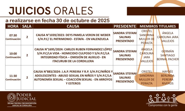 En cumplimiento a las decisiones del Consejo de Superintendencia de la Corte Suprema de Justicia, la Circunscripción Judicial de Cordillera da a conocer el calendario de juicios orales establecido para hoy 30 de octubre del año 2025.