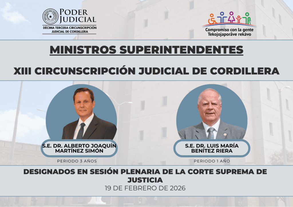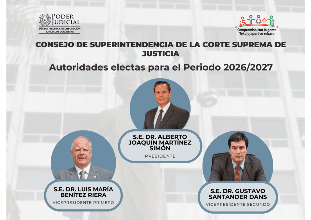 En cumplimiento a lo dispuesto en la Constitución Nacional y la normativa que regula la integración y funcionamiento del máximo tribunal de la República, en sesión plenaria ordinaria celebrada este jueves 19 de febrero, la Corte Suprema de Justicia eligió al ministro Alberto Martínez Simón como Presidente de la máxima Instancia Judicial para el período comprendido entre febrero 2026 y febrero 2027. Asimismo, fueron electos como vicepresidente primero el ministro doctor Luis María Benítez Riera y como vicepresidente segundo el ministro doctor Gustavo Santander Dans.