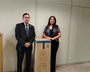 La Jueza Penal de Garantías Abg. Silvia Carolina Cáceres Riveros, y la actuaria Abg. Noelia Hartelsberger, han realizado la entrega de dos ventiladores de techo,