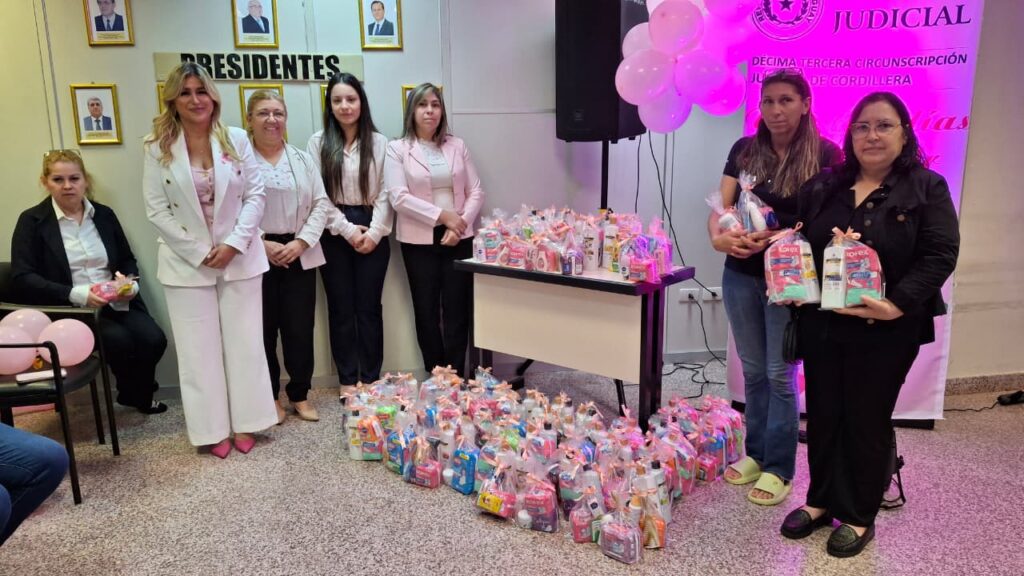 En otro momento de la actividad, la jueza Penal de Garantías, Silvia Carolina Cáceres Riveros y su equipo de funcionarios entregó una donación consistente en elementos de higiene personal para la mujer, a las representantes del grupo de familia María Auxiliadora y San Roque del barrio San Rafael de la ciudad de Caacupé.